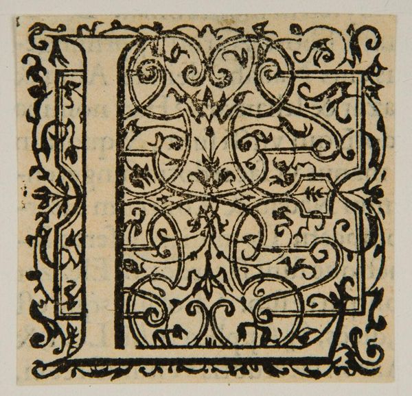 Editor: Here we have "Letter P" by an anonymous artist, and I’m struck by the contrast between the stark white letter and the densely patterned background. What visual elements stand out to you? Curator: Observe how the artist has utilized positive and negative space. The white 'P' establishes a clear form, yet the surrounding botanical motifs, rendered in black, vie for visual dominance. Do you see how the interplay of these elements creates tension? Editor: I do. It’s like the letter is fighting to emerge from the ornate design. Does the texture play a role? Curator: Indeed. The stippled background gives a tactile quality, enriching the overall composition. The linear contours of the letterform stand in stark contrast. Considering all, what have we learned? Editor: I see how the artist created visual tension and balance using form, texture, and the push and pull between positive and negative space. Thank you! Curator: A stimulating inquiry, focusing on the form itself.