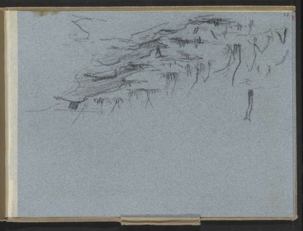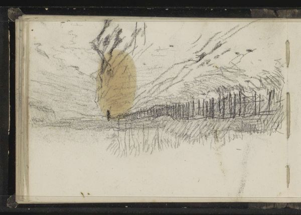 Editor: This pencil drawing, "Figuur in een landschap met bomen," or "Figure in a Landscape with Trees," is by Anton Mauve, created sometime between 1848 and 1888. It has this hazy, almost dreamlike quality. The figure seems lost in the landscape. What do you see in it? Curator: The most immediate impression is one of transience. Notice the sketchy, almost ephemeral quality of the lines. The landscape itself feels less like a physical place and more like a fleeting impression, a memory perhaps. Think of landscapes in dreams - they shift and change, yet they are so meaningful. What emotions does this evoke? Editor: It feels a bit lonely, and maybe a little nostalgic? Like a half-forgotten childhood memory. Curator: Precisely. And what does the figure itself suggest to you? Is it distinct, powerful, easily read? Editor: Not really, it blends into the scenery. Curator: Exactly. It is swallowed by the symbolic landscape. It seems less an individual and more a representation of humankind's small role within the vastness of nature. We carry a memory of this. The sparse details are less about a particular moment than a universal feeling of existing in the world. It points to something almost primeval. Editor: So it is less about a specific person, and more about a symbolic idea of being? Curator: Precisely. We recognise and carry this emotional image within our consciousness. And, though indistinct and hazy, it persists. Editor: It’s amazing how much emotion and cultural weight can be conveyed with such simple lines. I had not considered that before. Curator: Visual economy can indeed be rich in emotional depth.