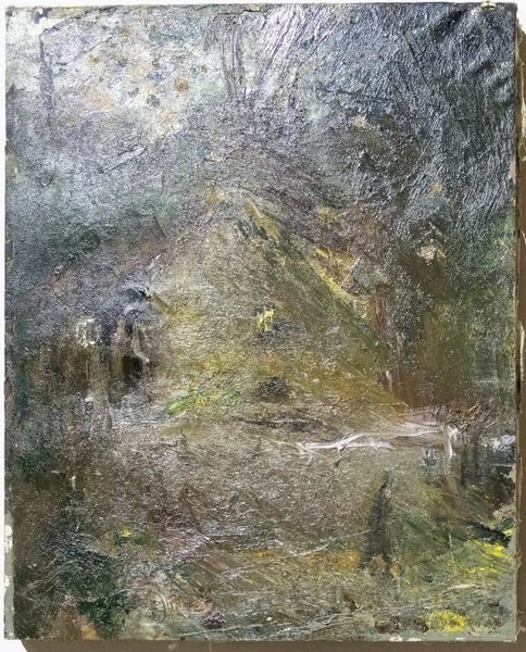 Editor: Oleg Holosiy's "Landscape" from 1985, made with oil paint, strikes me as particularly turbulent. The impasto texture and blurring of colors feel charged with raw emotion. What do you see in this piece, particularly in terms of how symbols might play out in an abstract context? Curator: It's a fascinating question! While ostensibly a "landscape," it seems Holosiy aims for a deeper resonance. Notice how the darker blues and greens dominate – these colours, often associated with melancholy and growth, seem to battle. Does it remind you of any landscapes, or evoke any memories associated with particular natural places or forces? Editor: I’m not sure of specific places. I just feel tension here – maybe it’s the contrasting dabs of light attempting to break through the gloom? Curator: Exactly! Those fragmented yellows and lighter greens function as symbols of hope or resilience. Consider the historical context; this was painted in the Soviet era. Could these subtle contrasts represent a yearning for freedom or an undercurrent of dissent amidst a more somber reality? Visual symbols need not be overt. Often it is the tension that communicates deeply felt emotion, in this case, the ambiguity and struggle for expression. Editor: That makes me see the painting completely differently. It’s no longer just about the surface appearance, but the possible layered meanings beneath. Curator: And that’s the beauty of engaging with art this way! By connecting imagery to history, psychology, and culture, we unlock a richer understanding. I'm glad to have explored the painting together. Editor: Me too. Thanks! Now I’m thinking about how even abstract forms carry a weight of cultural memory.