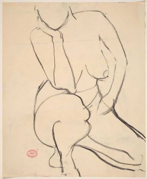 Editor: This is an ink drawing by Richard Diebenkorn, created sometime between 1955 and 1967. It’s simply titled “Untitled [nude resting on her side and lifting up on her right arm].” The thing that strikes me is how much is suggested with so few lines. What stands out to you? Curator: I am drawn to how Diebenkorn distills the human form to its essence, its symbolic weight. This isn't just a body; it's a representation of a collective understanding of the female form throughout art history. It makes me wonder, what aspects of the female nude are visually enduring, regardless of style or era? Editor: That's interesting. It almost feels classical despite its abstract expressionist style. Is that intentional, do you think? Curator: I believe so. Look at the pose—a reclining nude, echoing countless portrayals from antiquity through the Renaissance. Diebenkorn simplifies it, using stark lines to capture posture and form. The negative space around the figure also gains importance. Is that not the body itself, imbued with symbolic meaning? Consider the psychological weight of such depictions, how they can represent vulnerability, sensuality, or even power depending on the cultural lens. Editor: So the image carries more than just its literal representation; it holds layers of cultural meaning? Curator: Exactly. It invites viewers to tap into their own memories and understanding of such imagery. The lines create shadows but allow for openness. This speaks to the ongoing conversation about the body and the artistic traditions of abstraction and figuration during the 20th century. How does our understanding of historical contexts change our perspective of this contemporary art piece? Editor: That’s a powerful perspective. I'll never look at a simple line drawing the same way again. Curator: It reveals the complex tapestry of meaning woven into seemingly simple images, revealing both the cultural memory and ongoing conversation with forms that exist within.