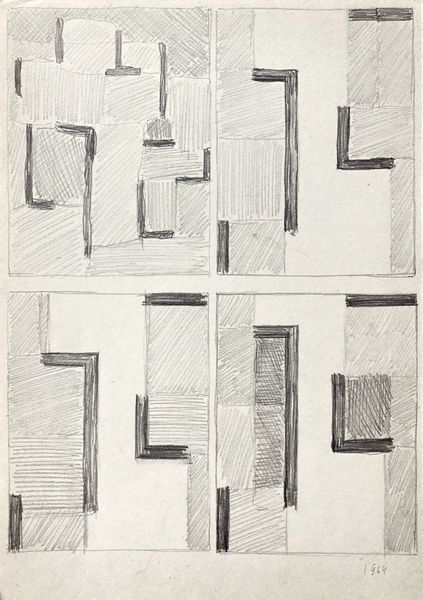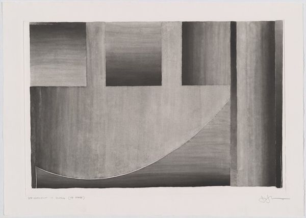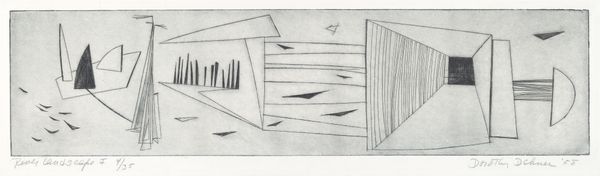 Editor: This is Dorothy Dehner's "River Landscape No. 4," an etching from 1958. It feels like looking at a fragmented memory, these almost architectural shapes hinting at a scene but never quite solidifying. What do you see in this piece? Curator: Immediately, I’m struck by the dance between structure and fluidity. These hard-edged geometric forms suggest buildings, or maybe docks, but the wispy lines and varied tones disrupt any clear representation. Doesn't this tension almost feel like an inner psychological landscape? Editor: Definitely. I’m interested in the "river" aspect, but I don't actually see any water! Curator: True. Consider water's symbolic associations: purification, change, the unconscious. Perhaps Dehner is less interested in depicting water literally, and more in evoking its deeper, emotional currents through the abstracted forms and the overall tonality of the print. How do you think the monochromatic palette influences our reading of the “landscape?” Editor: I guess without color, it becomes more about shape and suggestion. It really highlights the symbolic rather than the literal, forcing me to fill in the blanks. Curator: Precisely! It asks us to activate our own "cultural memory," to piece together these fragmented symbols and construct our own narrative of the river. And those angular shapes, almost totemic in nature – might they also represent our own internal architectures? Editor: That's a cool reading. I was too stuck on trying to find the river. Curator: And I was focusing too much on psychological landscape. Perhaps that tension of external scene versus internal world is the key here. Editor: I like that. Definitely gave me a lot to think about!