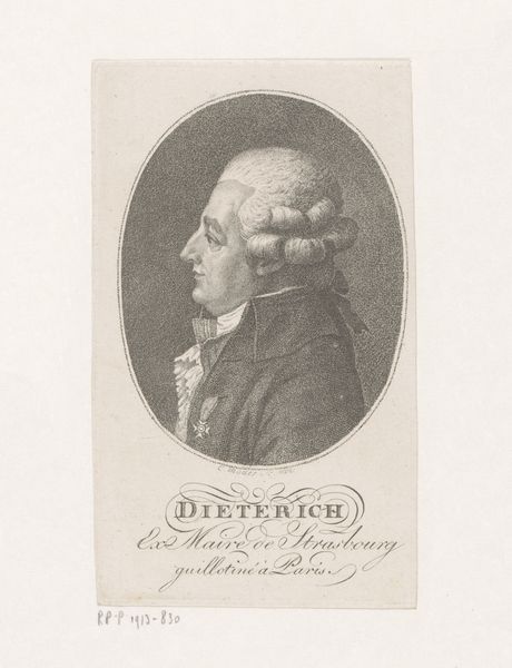 Hans Heger made this portrait of Professor H. Callisen using etching, a printmaking technique that democratized image production in the 18th century. The fine lines you see weren't drawn directly onto the copper plate. Instead, Heger coated the plate with wax, drew through it with a needle, and then bathed the plate in acid. The acid bit into the exposed lines, creating grooves that would hold ink. This process allowed for intricate detail and subtle tonal variations, visible in the professor's powdered wig and the delicate shading of his face. Etching's rise coincided with the growth of a market for images, reflecting a shift towards mass production and consumption. While Heger likely possessed skilled artistry, the etching process allowed for a multiplication of his work, making it accessible to a wider audience beyond the elite circles of painted portraiture. This speaks to the changing social landscape, where knowledge and representation were no longer confined to the upper classes, but becoming increasingly available through printed media.