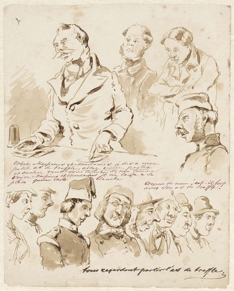 Editor: This is “Eight Heads of Ecclesiastics" by Jehan Georges Vibert. It looks like it was made using pen and pencil, a really detailed drawing of what I assume are clergymen. The shading is incredible. What's your take on this drawing? Curator: I am intrigued by the repetitive nature of this work. Look at the materials used: simple pen and pencil. Could this choice speak to the economic realities of artistic production at the time? Were drawings more accessible, perhaps a way to circulate images of power among a wider audience? Consider the labor involved in such detailed rendering, too. Editor: That’s a point I had not considered. I was looking at it more from the religious angle and thinking maybe it was making a statement. Do you not see the Church being relevant to how this work is interpreted? Curator: Not irrelevant, but I want to dig deeper. How did Vibert, through his use of readily available materials, participate in or critique the social structures of his time? The choice of pen and pencil is, I believe, as important as the subjects he depicts. Where were these clergymen, and what material comforts would they have been party to during their life in service? Did the artist intend for there to be a sense of contrast? Editor: So you're suggesting the drawing itself, as a physical object made of specific materials, tells a story about artistic practice and the social landscape, rather than just focusing on the clergymen as the subject? Curator: Precisely. Let's consider how this drawing, reproduced perhaps in prints, might have reached different strata of society. Its materiality and mode of production democratize the image, yet the subject retains its aura of authority. Editor: This has opened up an entirely different avenue for thinking about art. I’ve never thought about it so closely based on materials and its place in commerce! Curator: It challenges us to move beyond just aesthetics and delve into the social life of things, a journey where art becomes deeply connected with human labor and historical consumption.