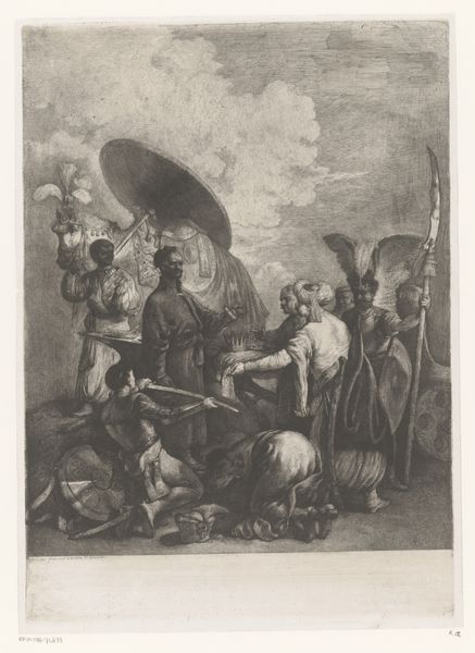 Robert Picou made this print, "The Arrest of Christ," sometime in the 17th century, rendering the scene in ink on paper through the process of etching. Here, the artist has harnessed a method of production that’s quite different than painting or sculpture. It’s a graphic medium, one that allows the creation of multiple images, each one a product of skilled labor. In this work, the lines are etched into a metal plate, which is then inked and pressed onto paper. This process allowed for the mass production and distribution of images. It’s worth noting that this print captures a key moment in Christian theology, but also reflects the socio-economic dynamics of Picou's time. The fine lines and intricate details speak to the skill of the artist, but also to the broader system of labor and trade that made such prints accessible. Ultimately, this print embodies the intersection of artistic skill and economic production. The artist invites us to consider how it operates not only as a work of art but also as a commodity, distributed and consumed within a complex social and economic landscape.