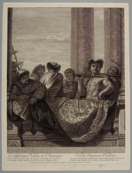 Editor: So, this is "Different Nations of Asia" by Louis Surugue. It’s hard to pinpoint the exact date, but he lived in the late 17th and early 18th centuries. It has such a staged, theatrical feel. What can you tell me about the cultural context of this image? Curator: It's fascinating how Surugue presents these figures. Given the title, "Different Nations of Asia," how do you think the artist engages with contemporary European views on the "Orient" and its people? Editor: That's interesting. I guess it's attempting some form of classification, but it feels a bit... detached. Curator: Precisely. It reflects Europe's growing interest in, and simultaneous distancing from, the East. It reveals much about the politics of representation. Editor: I hadn’t thought of it that way. It really makes you wonder about the power dynamics at play during this period. Curator: Exactly. Art is rarely just art; it’s a reflection of the world in which it was created and a powerful tool.
