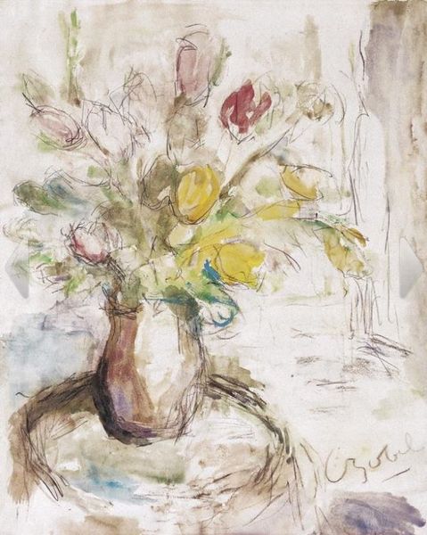 Editor: This is "Leaves in a Green Pot," a watercolor completed by Paul Cézanne around 1902. It’s deceptively simple, just a potted plant, but there's something so alive about the loose brushstrokes and vibrant greens. How do you interpret this work? Curator: The radical simplicity, yes. Cézanne, even in a seemingly conventional still life, is subverting our expectations and, perhaps more importantly, highlighting the inherent politics of looking. We must consider the role of still life throughout art history – traditionally a genre relegated to the domestic, to the feminine sphere. Do you notice how the painting challenges that framework? Editor: It’s definitely not fussy or precious, if that’s what you mean. It feels very immediate. The color is amazing too! It uses watercolor but feels very… raw. Curator: Exactly! It feels less like an attempt to replicate nature and more like an investigation of perception itself. How do the leaves function? Their color variance gives dynamism to the composition – an intentional destabilization, which undermines rigid hierarchical models. Are the leaves of a particular type that the artist observed? Or does this work focus on the experience of natural forms? What would you call that experience? Editor: Maybe an authentic human connection? He captures something more profound than just surface appearances. It shows a kind of empathy to nature. Curator: That resonates strongly. Consider, then, how Cézanne gives worth to elements considered trivial in art - a potted plant. He compels us to acknowledge beauty in places society tends to ignore. It's not merely art reflecting life, but actively valuing aspects of life dismissed for too long. Editor: I never really considered the politics of still life paintings. That’s definitely something I’ll think about next time! Curator: And I see how much an everyday natural environment contributes to building cultural identities. A humble plant claims an agency, thanks to the author.