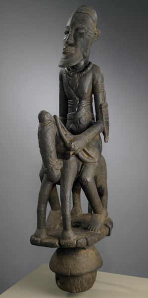 This is a wooden veranda post carved by Olowe of Ise, likely in the early 20th century. The sculpture presents a vertical composition, dominated by two large figures: a standing female supporting a seated male figure. The color scheme is subdued, with traces of blue paint on the standing figure. Olowe’s sculpture embodies a visual tension between support and authority. The female figure, larger in scale, carries not only a physical burden but also symbolic weight. This subverts traditional representations of power, challenging fixed notions of gender roles. The semiotic interplay here is rich: the figures' gestures, adornments, and relative positions function as signs. The veranda post destabilizes established meanings through its dynamic form. It invites ongoing interpretation and re-interpretation within broader cultural and philosophical discourses. The artist prompts us to reconsider the interplay between the aesthetic and the ideological.