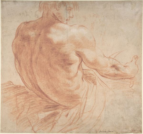 Editor: This drawing is "Weiblicher Akt aud einem Bett liegend nach links," a nude figure by Peter Paul Rubens, done with red chalk. It’s quite striking in its naturalness. What do you see in this piece? Curator: What I see is a very particular assertion of power dynamics prevalent in the Baroque period, when the male gaze dictated artistic representations of women. While the technical skill is undeniable, and there's an intimate quality in the drawing, consider how the woman’s passivity and vulnerability are emphasized. How do you think this contributes to or challenges ideas about the female form at the time? Editor: I guess I hadn’t considered that. It just seemed like a straightforward study of the body. But, thinking about it, she is positioned entirely for the viewer’s pleasure, isn’t she? Do you think Rubens was conscious of perpetuating this, or was it simply the artistic norm? Curator: That's the crucial question. Examining his personal context versus the broader social structures at the time is essential. Did his intentions align with challenging or reinforcing existing power structures? Thinking critically about representation allows us to confront the norms around gender, beauty, and objectification that have been historically ingrained in art. This isn’t just about Rubens; it's about us interrogating the gaze and power. Editor: This is super helpful in expanding my perception and pushing beyond initial impressions. Thank you. Curator: Absolutely. Keep asking these questions. They're key to unpacking how art both reflects and shapes our understanding of the world.