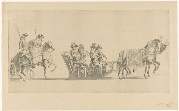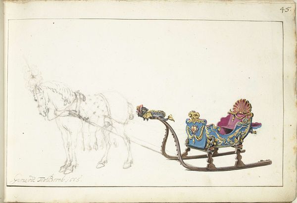 This is a drawing called "Veertiende slede" by Abraham Delfos, created in the 18th century. At first glance, the eye is met with a meticulous rendering of a winter scene, dominated by a horse-drawn sleigh. Delfos employs a delicate, linear style, with soft washes of color. The composition, while seemingly straightforward, carefully balances the figures and the sleigh within a defined space. Look closely, and the playful elegance of the Rococo period emerges. The pastel hues of the sleigh, juxtaposed against the darker tones of the horses, create a delightful visual rhythm. The artist’s attention to detail, from the horses’ ornate headpieces to the musicians’ attire, reinforces the theme of aristocratic leisure. The careful rendering of the scene, with its delicate lines and balanced composition, is not merely descriptive but also conveys a subtle commentary on social hierarchies and aesthetic values. This piece functions as a cultural signifier, embodying the spirit and the refined tastes of its time.