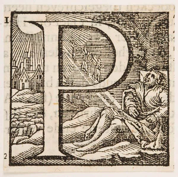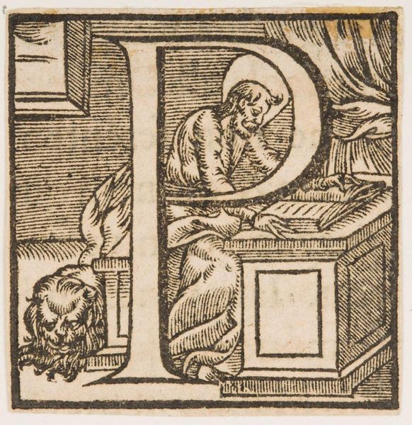 Editor: Here we have an intriguing woodcut, "Letter S," by an anonymous artist at the Harvard Art Museums. It's dense with figures and activity, all framed by the letterform. What's your take on the imagery here? Curator: The "S" initially presents itself as a simple letter, but it becomes a vessel for cultural memory. Notice the kneeling figure, seemingly a scribe, illuminated by a divine presence above. The letter then morphs into a stage for knowledge and devotion. Editor: That's a great observation. It seems the letter isn't just a letter. Curator: Exactly. It's a symbol layered with meaning. How does this interplay between text and image resonate with you? Editor: I see it now. It’s not just decorative; it's imbued with historical and religious significance, turning something ordinary into a narrative. Curator: Precisely. We learn about the era's values, revealed through the symbolic power of images in language.