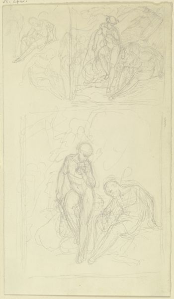 Curator: Right now, we’re standing in front of a work by Victor Müller called *Ein Mann mit großem Hut, dem sich eine Frau anschmiegt, rechts eine sitzende Figur*. It's held here at the Städel Museum. What's your initial take? Editor: Ethereal. Like a dream half-remembered. Or maybe a sketch left incomplete, hovering between potential and resolution. The lines, so faint...it’s like trying to grasp a fleeting feeling. Curator: Indeed. Müller captures something so ephemeral, even the title dances around pinning down exactly what’s happening. He employed pencil for this drawing on paper, focusing on figuration. Editor: The composition is quite interesting. There's the figure mentioned in the title, adorned with what looks like an outsized hat, and a woman nestling close. And then, set to the right, this more isolated figure. Semiotically speaking, their spatial relationships and relative isolations set up complex narrative possibilities. The use of line seems so very... careful. What do you sense it imparts, visually? Curator: For me, it suggests a psychological drama playing out. Perhaps of intimacy and isolation all happening at once. Müller teases at romanticism, hints, suggests... but never really tells. Does it spark curiosity about these people, these lives hinted at but never fully rendered? Or, speaking very informally...are they in love, disconnected or perhaps lost within themselves? Editor: Both, I think. Or all of the above, simultaneously. This might seem reductive, but the piece feels so inherently early modern—its lack of resolution, embrace of subjective perspective, interest in the play between the "real" and the "ideal"... Müller offers questions, visual gestures, and that, in itself, feels so modern. The almost casual strokes. How academic artists move so easily. Curator: And for you, the open-endedness of it, do you find that freeing? As though your imagination can fill in what's left unsaid? Editor: Precisely. Müller isn’t handing us a polished conclusion but rather an invitation. And maybe, that’s what makes this seemingly slight sketch so resonant. Curator: Beautifully put. For me, too, its incomplete quality is its biggest asset, and feels deeply...generous, artist-to-viewer.