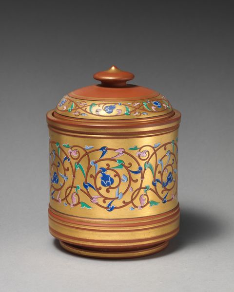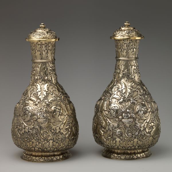 Curator: I’m drawn to the juxtaposition of these two forms—both containers, yet one radiant and open, the other closed and seemingly quite secretive. Editor: It's amazing to think these intricate containers, created from mixed metals and other media, were crafted around 1580-1585 by Bartholomew Newsam. He was Master of the English Royal Clockmakers at the time, and these pieces are currently held in the collection of the Metropolitan Museum of Art. Curator: Immediately, I’m intrigued by the shapes and the contrast in materials—one a deep, almost austere dark box with a pronounced lock, the other in gleaming gold with ornate fretwork. Editor: The darker box certainly evokes that sense of mystery! Beyond mere aesthetic appreciation, understanding Newsam's cultural and institutional positioning as the Royal Clockmaker illuminates his craft. He provided crucial instruments and time-keeping devices within the context of courtly life. Were these cases used to store timepieces, navigational equipment, or some other royal accoutrement? Curator: Perhaps. Considering solely the visual language, that intricate gold work suggests something delicate or precious held within. Semiotically, the perforations give a sense of displaying contents, almost of tempting display. Editor: Good point! Newsam was creating functional items, yes, but those objects also broadcasted political authority, technological advancement, and even a growing global outlook, right? These cases aren't isolated objects. They're entangled in a whole web of Tudor sociopolitical ambition. Curator: Certainly. Even viewing it formally, that locking mechanism serves a deeper purpose than simple security. In a Northern Renaissance decorative arts context, security, secrets, display… these merge to imply both social power and perhaps intimate knowledge. Editor: I appreciate how a focused look reveals such an intersection of aesthetic choices and sociopolitical significance. Newsam wasn’t just constructing containers but crafting symbols of royal reach. Curator: Agreed, this Traveling Case reminds me of art’s potent ability to signify beyond its material being.