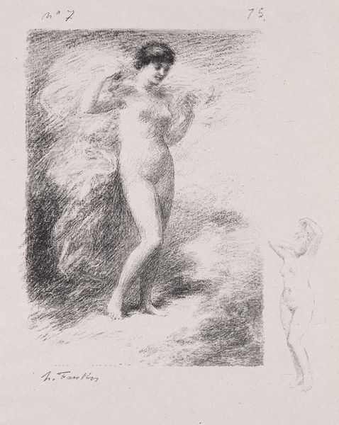 Editor: Here we have Anders Zorn's "Model before Picture," a small, delicate etching. The scene feels so intimate, like a glimpse into a private moment. What do you make of this fleeting scene? Curator: It whispers of the artist's inner sanctum, doesn't it? Zorn masterfully uses light and shadow, those rapid lines, to capture the model's vulnerability, almost a secret revealed. What's fascinating is how the artist's presence is subtly implied in the scene, wouldn't you agree? Editor: I see what you mean; I didn't catch that initially. Thank you! Curator: My pleasure, a new perspective is always welcome.