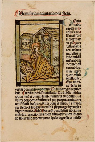 Curator: This is Illustration XVI, an anonymous piece held here at the Harvard Art Museums. Editor: It's surprisingly direct, even stark. The figures are outlined with such bold lines, and the colors are so earthy. Curator: Indeed. The artist uses a very limited color palette, typical of early book illustrations. Notice how the composition centers on the figure of Christ being presented to a seated figure, possibly Herod. Editor: The way Christ's figure is slightly bent forward gives him an attitude of quiet acceptance, and his halo signifies his divinity, creating a strong contrast with the seated figure’s jester hat. Curator: The placement of the text around the image is very intentional, acting as both a frame and a narrative support. It guides the viewer's eye, but also adds another layer of meaning to the artwork. Editor: Seeing these two elements—image and text—together really helps me to reflect on the narrative power of simple visual language. Curator: And for me, it’s a powerful reminder of how symbols can transcend time, continuing to speak to us across centuries.