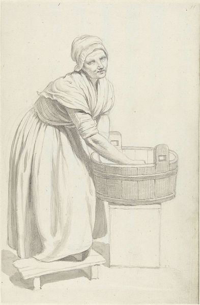 Editor: Here we have "Woman in Clogs with Basket, Three-Quarter View from the Back," created by Johannes Christiaan Schotel sometime between 1797 and 1838. It’s a pencil drawing held at the Rijksmuseum. It has a quiet, unassuming quality. What compositional elements stand out to you? Curator: The work’s visual interest lies primarily in Schotel’s effective use of light and shadow. Observe how the subtle gradations of tone, achieved through delicate pencil work, define the form of the woman and her attire. The basket, for instance, showcases a remarkable control of line and texture to render a woven object. Editor: It's amazing how much detail he gets with just a pencil. Do you think there's any symbolism here? Curator: Symbolism is a tempting avenue, but from a formalist perspective, consider the relationship between line and form. Does the somewhat rough and ready feel contribute to the work's authenticity? The precision of the drawing gives it integrity. It presents the ordinary and offers aesthetic beauty in everyday life, celebrating the compositional and textural elements. Editor: That makes sense. So it's less about what the woman *represents* and more about how Schotel *presents* her through the interplay of light, shadow, and texture? Curator: Precisely. Notice how Schotel captures texture and depth in the folds of her dress, juxtaposed with the smoother surface of her bodice. The negative space around her, carefully considered, further accentuates the subject’s form and presence. Editor: This has made me rethink how I see drawings. Thanks for helping me move beyond looking *at* a drawing, and to see it and experience its formal elements! Curator: Indeed. Hopefully you will contemplate more artworks as complete aesthetic statements and see the intention within their formal constructs.