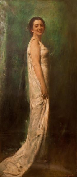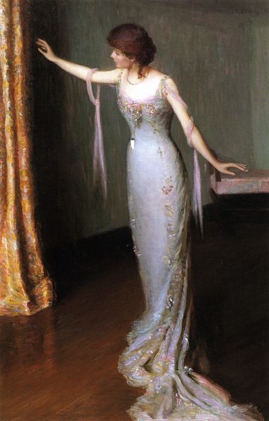Curator: Here we have Edwin Austin Abbey’s “Drapery Study of Queen Alexandra’s Dress, for The Coronation of King Edward VII,” dating from around 1902 to 1907. It's an exquisite study in gouache. What's your first impression? Editor: Light. Airy. Like captured moonlight. It feels almost like a memory of a dress rather than the dress itself, doesn’t it? It's funny how fabric, something so tangible, can feel so ethereal. Curator: Well, this wasn’t just any fabric, was it? The coronation of Edward VII was a highly staged affair, steeped in historical significance. Abbey, a popular American artist in Britain at the time, was commissioned to memorialize the event. This study allows us a peek into the meticulous preparation that went into representing power. Editor: It also strikes me that even without the queen *in* the dress, she's utterly present. Like her very essence is woven into the fabric. Do you think that’s intentional or am I just getting carried away by all the implied majesty? Curator: Both, perhaps! Court dress was essentially political armor. The jewels, the cut, the very fabric…it all spoke volumes about status and the continuity of the monarchy. And the very act of sketching, it places this object, and by extension, Queen Alexandra, within a visual lineage reaching back centuries. Editor: It also seems deliberately unfinished, somehow. As if the weight of all that history is threatening to dissolve the dress into pure shimmering gold before our very eyes. I bet that was fun to paint! To chase that fleeting impression… Curator: Indeed, the apparent lightness is deceiving. There's a real weight of expectation captured here, reflective of the era's obsession with documentation and preserving grand spectacle. I’d call it romanticism meeting Edwardian anxiety. Editor: Well, I think it’s lovely. More than the grand history, I like how such attention to detail reveals a universal human desire for ceremony, for a shared experience of awe, spun from silk and dreams. Curator: An astute point. In focusing on a gown, Abbey unknowingly shows us something timeless about human aspiration, regardless of royal context.