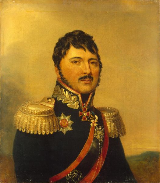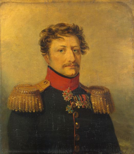Curator: This is a portrait of Cyprian Kreutz, a Russian General, painted by George Dawe in 1826. It resides here in the Hermitage Museum. What are your immediate impressions? Editor: Dark, commanding...melancholy. The muted color palette emphasizes the figure, but the sky behind him seems turbulent. Almost as if mirroring his internal state. Curator: Indeed. Notice how Dawe utilizes light and shadow. The subject's face is illuminated, drawing your gaze to his thoughtful expression, but the shadow adds a layer of seriousness. The overall composition is balanced, almost symmetrical. It directs your attention right towards Kreutz’s awards and stars. Editor: Precisely, it is like a visual codex—each medal signifies something beyond mere decoration. Those objects signal bravery, loyalty and the weight of leadership, amplified by the painting's realistic details in the rendering of metal and fabric. Curator: The choice of Romanticism further adds complexity. It emphasizes individualism but also emotion. It’s a statement about the heroic and the burden of it. Look closer at the eyes; he isn't just a General; he is a man shaped by conflict. Editor: He becomes an archetype through the artist's hand, a representation of dedication to Mother Russia! These historical portraits reinforce national narratives, which is a heavy undertaking considering the ever-shifting social values and their impact on tradition and cultural memory. Curator: I agree. Dawe's portrait provides insight into individual psychology but reflects the cultural narrative of his time, reminding us that symbols can carry diverse interpretations and historical layers. Editor: A single painting can evoke so many interpretations. We can see how visual structure alone holds the key to unlock broader meaning! Curator: Absolutely, it enriches our understanding of ourselves, our societies, and the continuing power of symbolism through the centuries. Editor: It's like finding an old map to feelings and cultural history we thought were lost.