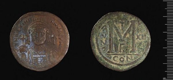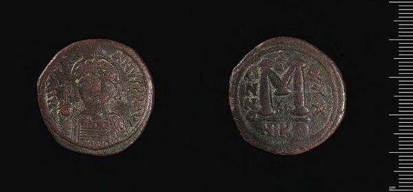 Curator: Looking at this coin, I'm struck by its intimate scale and the way it feels worn by time. There's a real weight to its history. Editor: Indeed. This is a coin of Justinian I, a tangible symbol of Byzantine imperial power and its complex relationship to civic life. Curator: The choice of imagery is fascinating. Justinian's portrait, encircled by inscriptions, juxtaposed with what appears to be a large 'M'. It speaks volumes about the construction of imperial identity. Editor: Yes, the "M" likely represents the denomination of the coin, but within Byzantine culture, it becomes more than just currency, a potent symbol of wealth distribution and imperial influence. Curator: Considering its circulation, imagine the hands it passed through! From merchants to soldiers, this coin connects us to a diverse range of experiences in late antiquity. Editor: Reflecting on the coin's materiality, its survival is also remarkable. It stands as a subtle yet powerful reminder of how deeply embedded political and economic systems are in shaping social and cultural histories.