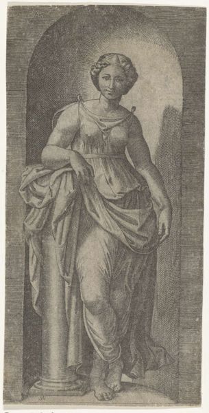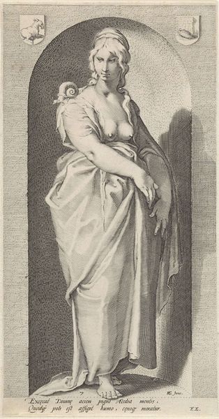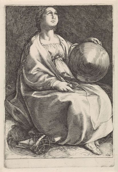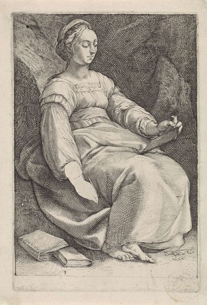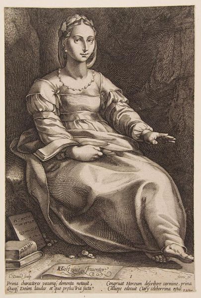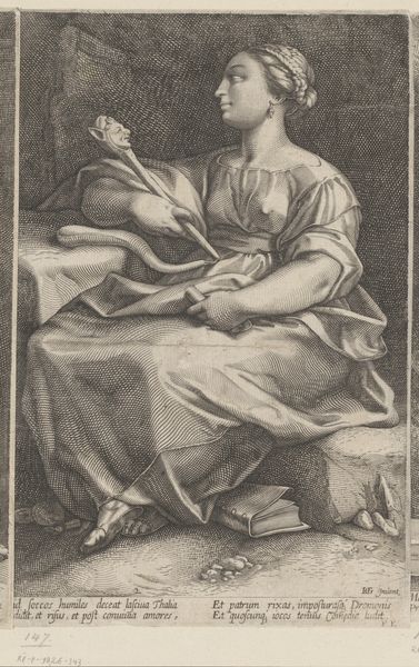 This is an engraving titled ‘Clio,’ currently residing in the Rijksmuseum. The fine lines and carefully constructed composition draw us into a contemplative space, where the figure of Clio, the muse of history, sits immersed in thought. The artist uses the contrast between light and shadow to model the drapery and the figure's form. Linear perspective draws the eye to the background, creating depth and encapsulating Clio in her private realm of reflection. The books scattered around her are not merely props; they act as semiotic markers of knowledge and historical narrative. The muse's gaze, directed downwards, signifies introspection, inviting the viewer to ponder the act of historical interpretation itself. The act of writing is emphasized through the implements held in her hands and the lines of text beneath. The very structure of the image encourages us to consider how history is constructed, narrated, and ultimately, perceived.