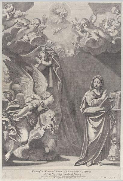 Editor: Here we have "The Assumption of the Virgin," a drawing made with pen, pencil, and ink by Michel Corneille the Younger, sometime between 1650 and 1710. The upward movement is striking; all figures look towards the light. What strikes you most when you look at this piece? Curator: Immediately, I think about the historical context that shaped depictions of the Virgin Mary. In Baroque art, like this piece, we see a real emphasis on dramatic movement and emotion, used here to amplify a message of divine intervention and power. But think about what this "assumption" really implies within a social context. Whose narratives are privileged? How might marginalized groups interpret this ascent to power? Editor: That's fascinating. I hadn't considered the power dynamics. It seems almost… exclusive? Curator: Exactly. The artwork also shows how the celestial realm reinforces a hierarchical system. The angels literally lift the Virgin Mary up, while the earthly figures below can only look on. And, what about the absence of female voices at the bottom? Could we view their silence as a symbolic representation of the constraints imposed upon women? Editor: I see what you mean. The male figures below are observers, rendered almost powerless, but their placement emphasizes their lack of participation in this ascent. The drawing seems to emphasize not only the Virgin Mary’s triumph, but the social structure which is implied by the celestial hierarchy itself. Curator: Precisely! Considering these social dimensions helps us engage in a deeper, more critical dialogue with the artwork. It allows us to recognize that even within religious iconography, we see reflections of the social power structures inherent in seventeenth-century Europe. Editor: I’ll definitely think about Baroque art differently from now on. Thanks so much. Curator: My pleasure! Keep questioning, keep looking.