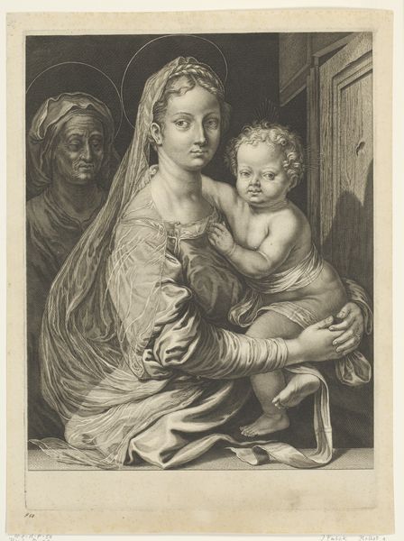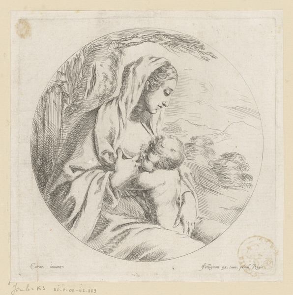 Curator: Here we have "Maria met Kind," an engraving likely made by Ignaz Günther sometime between 1735 and 1775. Editor: The etching strikes me as surprisingly intimate given its period. The Madonna's gaze downward at the Christ child really focuses the composition and brings warmth to an otherwise sparse image. Curator: That intimacy is definitely amplified by the engraving medium itself. The fine lines used create delicate shading, which lends to that sense of quiet tenderness. Also, notice the deliberate placement of their bodies in relation to each other; it's a motif stretching back centuries. Editor: I’m curious about the artist's choices, though. Why an engraving, for example? Was it simply the most accessible reproduction method for devotional imagery during that time, allowing for wider distribution? The line work seems… economical, perhaps, which makes me wonder if this piece was meant for more public or private devotion. Curator: That's a crucial point. The engraving served to democratize religious art. These weren't necessarily luxury items destined for private chapels; prints like this made devotional imagery affordable for a broader populace. It allowed the symbolic power of the Madonna and Child – motherly love, divine connection, hope – to permeate daily life. Editor: It does offer some insight into Baroque-era aesthetics – the embrace of linear form over color to render feeling. Considering this as part of an active marketplace also reveals how cultural values surrounding family are made, bought, and consumed through popular materials. Curator: Indeed. Consider, too, the weight these images carried culturally. They’re not merely representations; they actively shape perceptions of motherhood, divinity, and the ideal familial structure. This single sheet of paper, produced en masse, became a powerful tool for propagating specific ideological viewpoints. Editor: So, while this small engraving seems quite simple, it's a valuable reminder that images, even those produced for popular consumption, can carry significant social weight. Thanks for drawing my eye to this image. Curator: And thank you for framing our look with social context in mind!