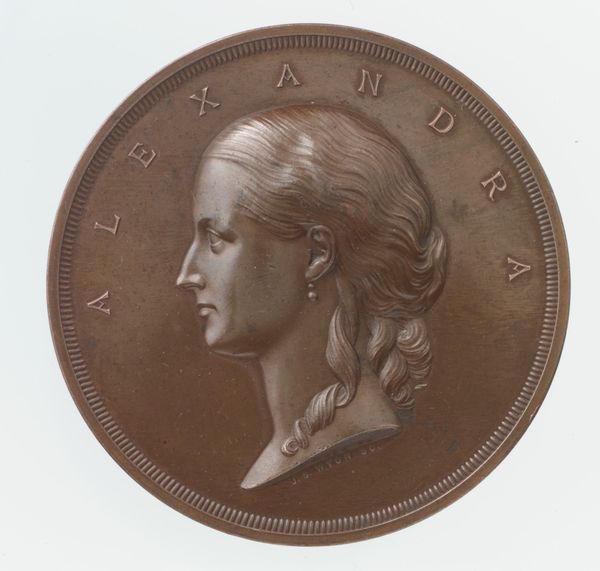 Curator: This is the Jurors' Medal from the Great Exhibition of 1851, crafted by William Wyon in bronze. What's your initial take on this piece? Editor: It strikes me as… severe. A profile portrait is always rather formal, but the bronze lends a particular weightiness. I wonder if the solemnity accurately reflects the mood surrounding the Exhibition. Curator: It’s more complicated than that. The Great Exhibition was intended to showcase British ingenuity, and the aesthetic here projects authority through the classical realism typical of profile imagery. Notice the sharp detail – the crispness of their hair, the line of their noses. The composition places Victoria and Albert close, almost merging, which semiotically suggests a unified British Empire. Editor: That may be true, but it's also important to understand how the royal couple engaged with art. This wasn’t simply a state event; Victoria and Albert very consciously shaped their image through the cultural products of the time. They actively curated their legacy, as we all do. A medal such as this isn’t just about aesthetic authority, it's about the political power that profile imagery has commanded throughout centuries. The Great Exhibition was largely Prince Albert's idea, intended as a moment of immense self-promotion. Curator: Indeed, the choice of bronze, rather than gold or silver, also suggests accessibility. The medal would have circulated relatively widely, reinforcing the visibility of the monarchy to a broader audience. It also represents power. In 1851 bronze would call upon the history of Roman authority, drawing parallels that reinforced British national pride through the medium. Editor: This makes me wonder about its role today. Now, this is housed in the Metropolitan Museum. Its purpose has fundamentally changed. It is not really about propagating authority, it has now become a historical relic that art audiences interpret and analyze as a kind of artwork in and of itself. How do you view it through that modern lens? Curator: It’s interesting you frame it that way. Viewing it now, apart from the social and political forces behind its making, it possesses a compelling structure: the round format containing a carefully organized arrangement of text and figures, balanced with minute precision. This composition is itself worthy of our attention. Editor: Precisely! Considering both perspectives, this medal speaks volumes about a particular moment in history. It shows the monarchy, the country, its relationship to itself. Curator: Indeed, and that complex meaning is cleverly articulated through visual form.