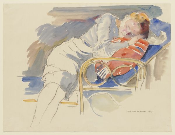 Editor: This is "Woman Seated on a Sofa with a Child on Her Lap" by Mark Rothko, rendered with watercolor and drawing. It seems quite intimate and tender in its depiction of a mother and child. What aspects of this drawing grab your attention? Curator: I'm immediately drawn to the *making* of this image. Consider the rough paper stock Rothko chose. It wasn't primed or prepared for this intimate scene; instead, its cheapness forces us to recognize the labor behind artistic representation. Look, too, at the rapidly applied washes of color – blue for the skirt, muddy browns for the floor, quickly defining the room's volume through a study of material production. Editor: So you're focusing on the tangible qualities of the work, and what that might imply. Curator: Precisely. Think of the early 20th century and the changing role of women, increasingly working and contributing to the economic sphere, as a kind of mass production of labor and commodity; consider also that watercolor drawings and mass-produced. By focusing on these choices –the material constraints, rapid execution – aren’t we compelled to reconsider sentimentality typically attached to images of motherhood and see its ties to the everyday economy? It isn't just *a* mother and child; it is *every* mother who works! Editor: I see, viewing the image within its production, within its economic realities gives it an alternate, very potent meaning. It shifts from just a sentimental genre painting. Curator: Exactly. Rothko is cleverly confronting and expanding those expectations using materials to invite questioning rather than offering reassurance. And this perspective makes the work still relevant today! Editor: Thanks, this definitely encourages a very different reading, a deconstruction through the artistic and social context. Curator: My pleasure; looking closely, always interrogating the method can open new worlds.