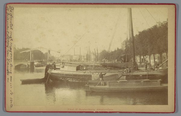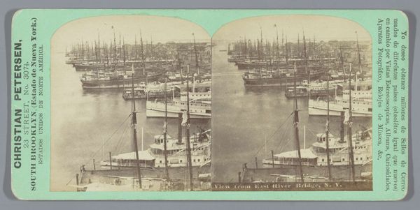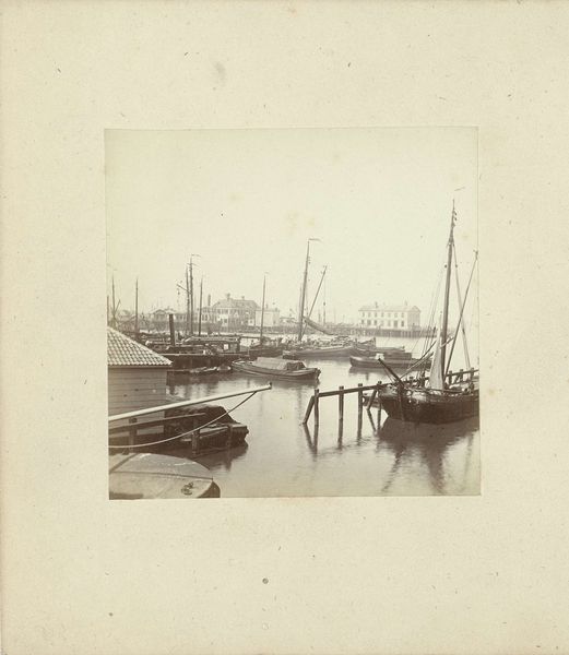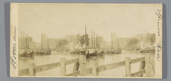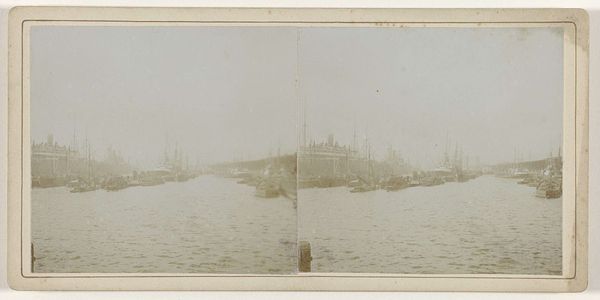 Editor: This is a gelatin-silver print titled "Gezicht op de haven in Hamburg, Duitsland," placing us in Hamburg harbor between 1860 and 1870, courtesy of Charles Gaudin. There is something wonderfully bleak and romantic about the composition. All the ships lined up create these dense layers that I find truly compelling. How do you see it? Curator: Focusing on its intrinsic structure, we see an immediate division. The imposing, dark vessel in the foreground forms a stark contrast to the delicate, almost ethereal skyline punctured by the church tower. It is a clever orchestration of dark and light, mass and line. Editor: That contrast is really enhanced by the gelatin-silver process, isn’t it? All of the silvery grey tonalities create this really nuanced sense of space and depth, giving us detail up front while keeping a softened touch for everything farther away. Curator: Precisely. The materiality of the gelatin-silver print enhances this effect. Think about the intentionality within pictorialism: blurring boundaries and playing with tonal ranges invite closer inspection. What strikes me, though, is how the repetitive verticals of the ship masts act as a counterpoint to the horizontality of the water. Editor: Now I am wondering about that tension you mention... Does that visual tension introduce or perhaps heighten a sense of anticipation within the pictorial space? Is the stillness deceptive? Curator: Deceptive stillness. Intriguing thought. Perhaps. Yet, consider the balance, the equipoise the photographer creates by carefully arranging and rendering forms. Even if present, any underlying tension serves, first and foremost, to further draw one into contemplating spatial relations within the image plane itself. Editor: Thanks, that reframing really offers a more insightful formal understanding of the photographic choices at play. I have much to consider, and am so appreciative of your astute perspective. Curator: Indeed, art, like any semiotic endeavor, functions precisely because we attend to the relational logic through which meanings take shape. Thank you for your questions, I have enjoyed it!