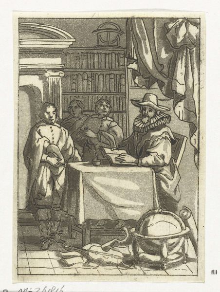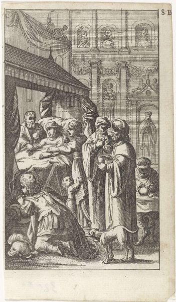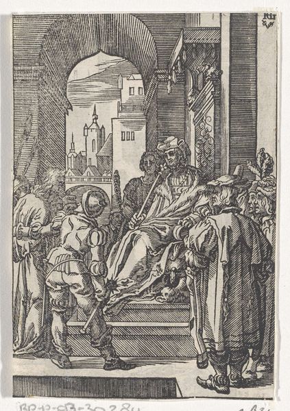 Curator: This engraving, titled "Judith with the Head of Holofernes", dates from around 1500-1520 and is attributed to the Monogrammist RR. What stands out to you? Editor: My first thought is just how brutal this scene is, rendered in such meticulous detail. The women exiting with Holofernes' head—it is chillingly well-defined. Curator: Indeed. Engraving, as a printmaking technique, allowed for distribution and widespread access. Consider the skill involved in producing this. Each line etched into the metal plate required intense labor, precision. What audience were they trying to reach, what impact would this image have had? Editor: And beyond the technical skill, think about the narrative. Judith, a Jewish widow, bravely enters the enemy camp and seduces Holofernes, the Assyrian general. Then she beheads him in his sleep, saving her people. This image plays into gender roles of the time and of how women had agency of their sexuality in wartime. A deeply troubling power dynamic in the scene that reveals the political power wielded by women under siege, then and now. Curator: Exactly, we see an allegory of the weak defeating the strong, a classic theme. How do we reconcile celebrating such acts of violence when enacted by marginalized people, considering both the power structures then and the reception of this engraving itself? It would have been circulated and sold to the masses; each of those individuals has to be accounted for. Editor: It forces us to confront uncomfortable truths. About how narratives of resistance are often intertwined with violence. The question then is who gets to tell these stories and to what end? Did this image serve to empower or exploit this moment? Curator: The artist has left us much to unpack. We've been confronted not only by this stark historical act of defiance but challenged in our very understanding of it in a different light. Editor: Precisely. It has broadened my understanding and given me so much more to explore beyond what’s visible at first glance. Thank you!