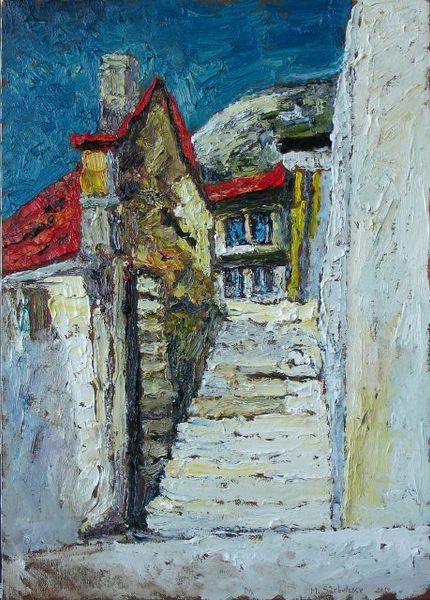 Periklis Vyzantios captures a sun-drenched alleyway in this painting. The architecture, particularly the arches, speaks of a historical lineage stretching back to ancient Ionia, a region known for its cultural and artistic achievements. The arch, a symbol of transition and passage, is seen in doorways and structural supports. The arch is one of humanity’s oldest and most universal forms, reappearing throughout civilizations. From Roman aqueducts to Gothic cathedrals, it has been a constant presence. In Ionian alley, this symbol of strength and continuity also suggests a psychological journey. Narrow passages can represent the subconscious, where collective memories reside. The sunlit buildings evoke a sense of timelessness, the light and shadow playing on the walls suggesting the layers of history embedded within. The viewer is drawn into this quiet, contemplative space, invited to reflect on the enduring power of cultural symbols.