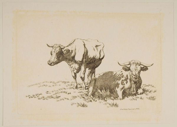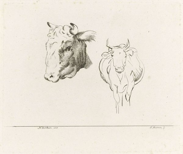 Jean Bernard created "Two Studies of a Cow's Head" using pen in the early 19th century. Bernard was working in a period where the Dutch countryside was being carefully cataloged and celebrated, reflecting a deep connection between national identity and the land. These studies highlight the agricultural backbone of Dutch society. By focusing on the cow, Bernard draws attention to the intimate relationship between humans and animals in rural life, while subtly nodding to the economic importance of livestock. This was a time when the agricultural sector played a crucial role in shaping the social and economic fabric of the Netherlands. Bernard’s careful rendering of the cows' features invites us to see them not just as livestock, but as individual beings. It evokes a sense of empathy and connection, prompting reflection on our relationship with the natural world and the animals that sustain us.