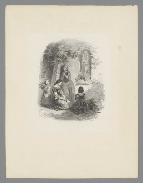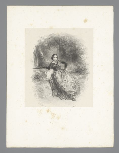 Curator: Welcome. Before us hangs a print attributed to Célestin Nanteuil, titled "Vrouw met paard, hond en bediende"—or "Woman with horse, dog and servant"—created sometime between 1826 and 1880. Editor: Immediately, I'm struck by the stark contrast between the dark, imposing figure of the woman and the rather subservient, almost caricatured depiction of the servant. It's a powerful statement about social hierarchy, even before we delve into symbolism. Curator: The composition is carefully arranged to emphasize that hierarchy. Observe how the woman, elegantly attired and centrally placed, dominates the visual space. The positioning of the horse and hound further accentuates her status, acting almost as emblems of her wealth and position within the society depicted. Note the textures achieved with the engraving technique. Editor: The dog, an elegant greyhound, appears alert but almost pleading, further underlining the themes of domesticity and dependence that permeate the image. The horse is interesting – almost spectral and relegated to the background. Its prominence is undeniable, a potent symbol. Curator: Precisely. The horse, often a symbol of power and virility, is here subdued, literally behind the woman and a subordinate, adding another layer to the representation of gender dynamics. In this Romanticist example, look closely at the detail given to the texture of the servant's clothing, compared to that of the mistress' fine, flowing dress. Editor: Absolutely. It almost feels like a scene lifted directly from a novel, with the woman as the stoic, central figure navigating a complex social landscape. I sense echoes of Austen and Brontë, don't you think? The racial aspect, I cannot ignore either. Curator: It’s certainly an example of its era, replete with societal commentary. However, stripping back the socio-historical interpretation, one can’t ignore the mastery with which Nanteuil balances light and shadow. The play of lines in the trees behind creates a sense of depth that pushes the figures forward, further highlighting the subject’s rigid stance and the formality within this piece. Editor: A formal study enhances the artwork. I find this depiction deeply resonant, echoing tales of power, control, and the often-uneasy relationships defining social status, played out on the stage of domestic life. Curator: Indeed, a piece that remains fascinating, both for its artistic execution and the cultural values it inadvertently reflects.