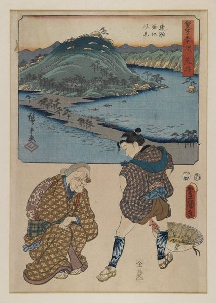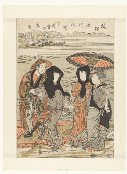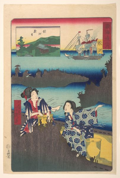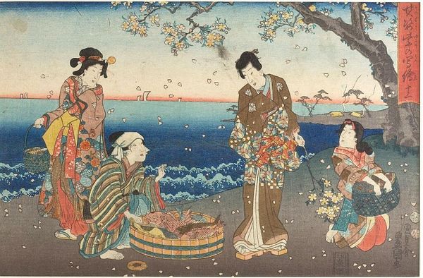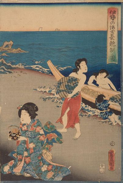 Curator: This is "Three Women and Waves," a watercolor attributed to Utagawa Hiroshige, created sometime in the 19th century. It exemplifies ukiyo-e style, portraying a tranquil, figural seascape. What strikes you most when you first encounter this artwork? Editor: The stylized waves dominating the composition give it a surprisingly dynamic mood. And beyond that, it all suggests something larger at play; something historical. Curator: Indeed. Focusing on materiality, notice how the use of watercolor on paper necessitates a delicate, layered approach. Each wave, each ripple, is built up through successive applications, requiring careful planning and skillful execution. Consider also the context: prints like these were part of a burgeoning commercial market catering to a diverse audience. Editor: From my perspective, those waves embody both the beauty and the potential danger of nature. And in the foreground, the three women offer distinct symbols of societal roles. One is playful, exploring the shore; another is observant; and the last, carrying an umbrella, seems almost burdened by tradition. Even the fan can symbolize one's class standing. Curator: Utagawa, operating within a rigid system of apprenticeship and workshop production, crafted this piece for mass consumption. The woodblocks used for printing would have been carved by specialized artisans, their labor integral to the final product. How do you read this production in the work’s symbology? Editor: To that end, there are subtle but clear visual echoes of resilience and adaptability throughout. In those garments, their patterning speaks to complex societal narratives; from geometric patterns that might suggest rigid structures, juxtaposed against flowing fabrics hinting at liberation and modernity, all playing with this deeper current. Curator: So, when we appreciate Hiroshige's “Three Women and Waves,” we're not only admiring his artistic talent but engaging with the systems that supported, and constrained, his output. Editor: That’s a very astute observation. With so much symbolic nuance subtly placed within each image, one almost imagines Hiroshige winking mischievously through the ages!