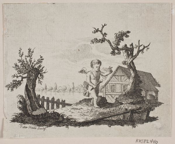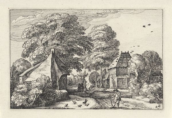Editor: So, this etching by Jan van de Velde II, “Square Tower Used as Inn near a River," dates from around the 1640s. The scene has a quiet, almost melancholy feel. There’s a real contrast between the imposing architecture and the tiny figures. What do you see in this piece? Curator: I see a layered narrative reflecting the societal tensions of the Dutch Golden Age. While celebrated for its artistic and economic prosperity, it was also a period marked by strict social hierarchies and colonial exploitation. Notice how the tower, possibly repurposed, looms over the seemingly mundane activity of travelers. Editor: That’s interesting, I was just looking at it as a snapshot of daily life. Curator: Precisely! Van de Velde isn't just documenting a landscape; he is hinting at the power dynamics inherent in land ownership and commerce. Consider who likely owns the Inn, versus who seeks lodging. What stories might they carry? How does the establishment profit from the labor of others? The river also evokes connections to global trade networks and colonial ventures that enriched the Netherlands. How do you think this seemingly innocent landscape masks its complicity? Editor: I guess I hadn’t thought of it like that, but the trade connections make sense. The figures now appear to me as part of this bigger global process of colonialism. Curator: Exactly. Think of it in relation to the landscapes of the time produced by, say, Jacob van Ruisdael, which evoke the glory and beauty of nature – yet that idealization often obscures the role those lands played in supporting an economic system built upon the labor of many and often benefiting few. Editor: This definitely encourages me to dig deeper than just the surface-level representation. Thank you. Curator: Absolutely, art invites critical engagement with its historical and social context. It challenges us to consider whose stories are being told and whose are being marginalized.