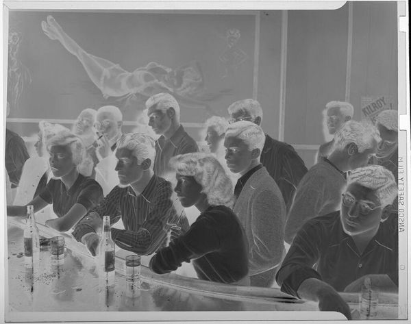 Curator: What a striking image. This is John Howell's "Untitled (men smoking and drinking)," held at the Harvard Art Museums. It measures roughly 4 by 5 inches. Editor: The negative space makes the scene feel almost ghostly. It's a group of men, all in suits, smoking and drinking, a tableau of mid-century masculinity. Curator: The social context of such a gathering is fascinating. Suits denote power, while smoking and drinking suggest leisure, but also perhaps stress. The ritual of it all, the materials of wealth and status on display. Editor: I see those repetitive gestures as symbolic. Each man holds his glass, each holds a cigarette, almost like holding totems of their shared social identity. Curator: And what about the labor behind those suits, those drinks? The process of manufacturing such items for their consumption is crucial. Editor: That may be true, but I can't help but focus on the symbolism of the glass and the smoke, the rituals they are undertaking. Curator: Food for thought on how the materiality and symbols connect. Editor: Indeed, a study in contrasts.