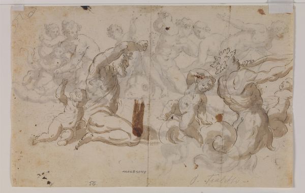 Editor: This is Gaspare Diziani's drawing, "Alexander and the Family of Darius," made around 1750-1760 with red chalk and ink. It looks like a quick sketch, full of movement. What do you make of this scene? Curator: This drawing exemplifies the Rococo interest in grand historical narratives, reinterpreted for contemporary audiences. How do you see this playing out, given what you know of Rococo art and its social function? Editor: I guess they’re using the past to talk about their own time... Like, Alexander's clemency could reflect a desired ideal of leadership in the 18th century? Curator: Exactly! These history paintings weren't just illustrations, but also moral examples aimed at the aristocracy, subtly reinforcing codes of conduct. Didactic in nature, how are these "lessons" distributed within and outside the Court environment? Editor: Hmm, these would've been circulated as prints and engravings beyond the court, right? I bet people would recognize the story, but would they question why Diziani chose *this* scene, where Alexander shows compassion? Curator: An excellent question! The choice certainly steers clear of the more bellicose aspects of Alexander’s life, framing him, instead, as a figure of enlightened power. Now consider the drawing's location in the Städel Museum – how does *that* institutional framing shape its meaning for us today? Editor: That’s fascinating – framing it within a collection alongside other works impacts how people see it. So, a history painting on themes of ethics is influenced by the art world itself. Thank you! Curator: Precisely. Thinking about art's institutional journey adds crucial layers of interpretation. It's all about contextualization.