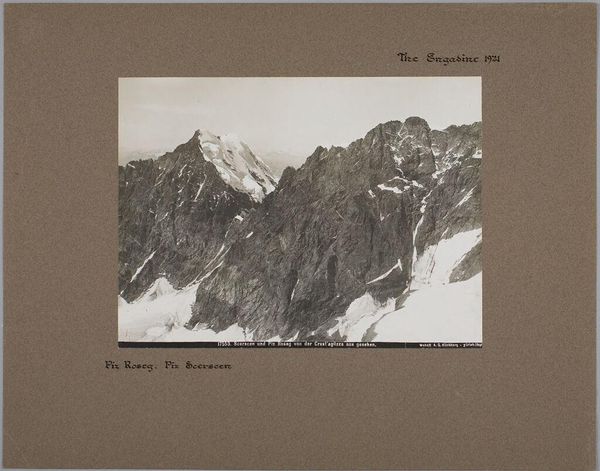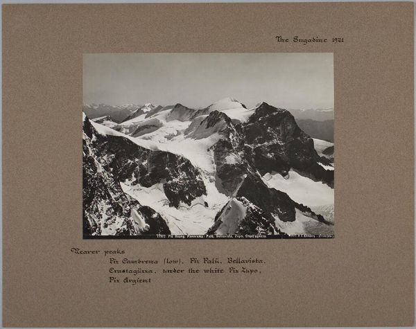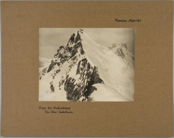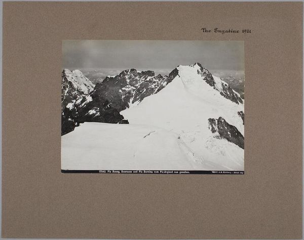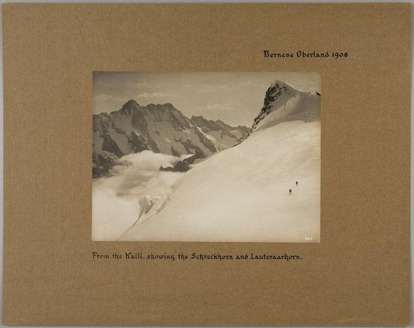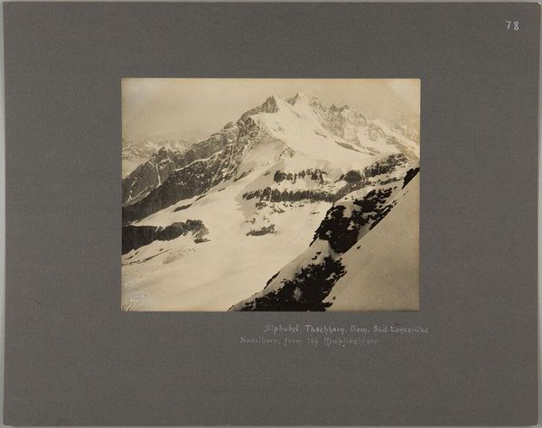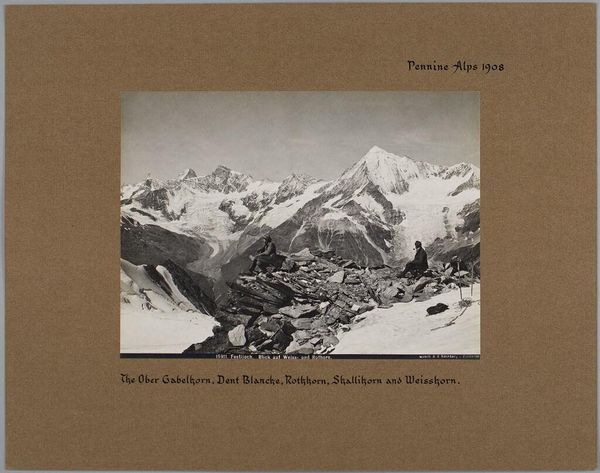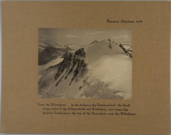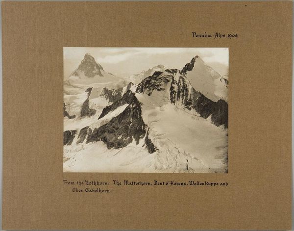Editor: This photograph, "From the Mettelhorn, The Rothhorn, Pennine Alps," was taken by George Perry Ashley Abraham. It's a silver print, and the mount is dated 1908. What strikes me is the sheer scale and the kind of romantic sublime feeling it evokes. How do you interpret this work in its historical context? Curator: The rise of mountaineering in the late 19th and early 20th centuries fueled a demand for images like this. Consider how photography, particularly within institutions like the Harvard Art Museums, played a role in shaping perceptions of nature and national identity. It also promoted tourism, didn't it? Editor: Absolutely, it did. I guess I hadn't considered the commercial aspect so explicitly. Curator: It is a powerful reminder of how art is inextricably linked to social and economic forces.