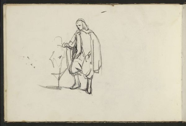 This is a pencil drawing titled, 'Wood Gatherer and a Woman on a Donkey' by Willem Cornelis Rip. The composition here is divided into two distinct areas, each featuring a solitary figure against a vast, empty background. On the left, a figure is shrouded in a cloak, carrying wood. To the right, we see a woman mounted on a donkey. Rip's use of line is particularly striking. The contours are softly defined. The loose handling of the pencil gives the sketch a sense of immediacy. The texture created through varied pencil strokes offers a glimpse into Rip's artistic process, revealing his attempt to capture form and light with a light hand. The absence of detail, especially in the background, enhances the sense of isolation and stillness, prompting us to consider the deeper narratives embedded in these figures. Are they merely representations of rural life, or do they symbolize something more?