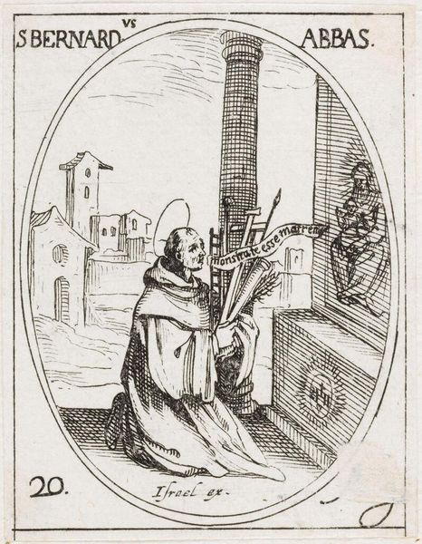 Editor: This is Jacques Callot's "Saint Cesarius," an etching. It's small, but the scene feels so dynamic. What strikes me is the contrast between the standing figures in the foreground, and the crumbling architecture in the background. What is your interpretation of the scene? Curator: Consider the power dynamics at play. Callot was working during a period of intense religious and political conflict. Who is granted authority, who is marginalized? The architecture, in its state of disrepair, seems to suggest the decay of existing structures. How might this reflect anxieties about societal change? Editor: That's fascinating! I hadn't considered the architecture as a symbol of societal anxieties. Curator: Art often holds a mirror to the times. Examining it through the lens of history can reveal hidden meanings. Editor: I see the image in a completely new way. Thanks!