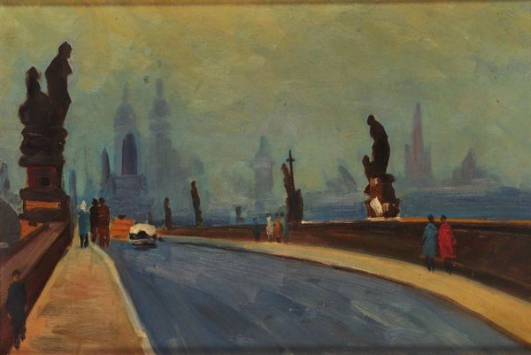 Editor: So, we're looking at "Venice. Memory," an oil painting by Boris Kustodiev, created in 1918. There's a hazy quality to it, almost dreamlike, with figures strolling along what appears to be a Venetian waterfront. It feels nostalgic, perhaps a little melancholic. What jumps out at you when you see it? Curator: It whispers, doesn’t it? Like a faded postcard discovered in grandma’s attic. I see more than just Venice; I sense a yearning. Kustodiev painted this while grappling with serious illness. Could Venice be less about the actual place, and more about a vibrant past he's struggling to hold onto, a symbol of vitality slipping away? Do you feel that fragility in the brushstrokes themselves? Editor: That's interesting. I was so focused on the soft colours and implied narrative that I didn’t immediately think about the artist's personal context. There’s almost a contrast – the beauty of the scene and the somber circumstances. Curator: Exactly! Consider the muted tones, the slightly blurred edges. It's impressionistic, yes, but with a layer of something… wistful, even. Look at the figures, how they seem to float, barely anchored to the ground. Memory, especially when coloured by illness, is like that, isn't it? Fleeting, fragmented. What is one element you want to capture if you paint what is in your memory? Editor: I guess I see it as the way figures fade as if they’re not really ‘there.’ Almost ghostly, suggesting how our recollections dim over time. The arches framing the scene also seem like portals or a theater stage. Curator: Yes, and think about that theater – life itself perhaps? A stage upon which Kustodiev is remembering his most precious acts before the curtain falls. Perhaps even our own lives! What has painting taught us about viewing our future or past with clarity, and not with fog? Editor: It's really made me think about how much an artist's personal experiences shape their work, and how what looks like a pretty cityscape can be so much more complex. Thanks for showing me that. Curator: My pleasure! Hopefully, it will leave everyone who looks at this painting a little less passive and instead makes them become creative in seeing things we would have not previously understood without each other.