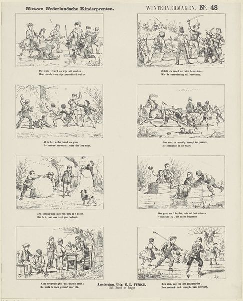 Curator: We're looking at "Een droom," which translates to "A Dream," an 1881 engraving by De Ruyter & Meijer. Editor: It's immediately striking. The overall impression is fragmented, like stills from an animated film. Curator: Absolutely. De Ruyter & Meijer have crafted a series of narrative panels on a single sheet, emulating sketchbook art. It combines imagery suggestive of the indigenous Americas. Note the variety in rendering and textural play—observe the lines making up different sections. Editor: There is something about the mark making. These marks and lines are not just descriptive, they also are building mood. In some areas of the sheet there is frenetic mark making suggesting conflict. This technique also contributes to a raw, sketch-like energy which underscores this work’s place within visual culture as opposed to high culture Curator: Precisely! They were engaging with prevailing depictions of indigenous cultures. Note how labor is involved in mass production versus that involved in singular drawings. How do these different means influence or relate to the depiction and reception of art Editor: Thinking about the engraving process itself, and its historical context in relation to visual materials—you know, these distributed prints really fueled how society understood people and their conditions. I imagine a world of imagery constantly reinforcing some of those ingrained preconceptions about different groups. Curator: A print like this enters into a cycle of production and consumption shaping perceptions while relying upon its audience and producers Editor: It really prompts you to consider what a 'dream' signified, not just for the figures depicted, but what these publishers imagined audiences found so captivating. I now think differently about the relationship between maker and object with that social cycle you've described in mind.