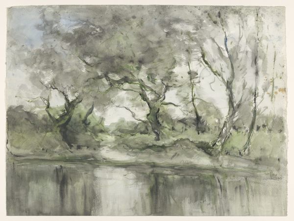 Curator: This is William Richard Lethaby's "Evening Landscape," a watercolor piece currently held in the Tate Collections. Editor: The immediate impression is one of brooding stillness, wouldn't you agree? The heavy greens and somber sky evoke a very specific mood. Curator: Absolutely. Look at the visible brushstrokes, the direct application of pigment. It speaks to Lethaby's engagement with the Arts and Crafts movement, emphasizing the artist's hand and honest materials. Editor: I'm struck by the near-absence of light. It lends a symbolic weight, perhaps suggesting a transition, the end of a cycle. The dark trees almost feel like guardians. Curator: Perhaps, but consider the societal factors. As an architect and designer, Lethaby championed craftsmanship against industrialization. This landscape could be read as a yearning for a pre-industrial pastoral ideal. Editor: A valid point. Still, that sliver of light on the water hints at something beyond the immediate gloom. It's a compelling blend of the real and the symbolic. Curator: Indeed. Seeing the process so clearly allows us to understand it as a product of its time and Lethaby’s values. Editor: I concur, and the enduring symbolic power continues to resonate deeply.