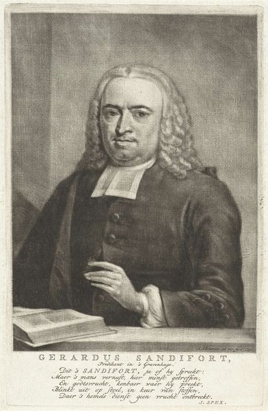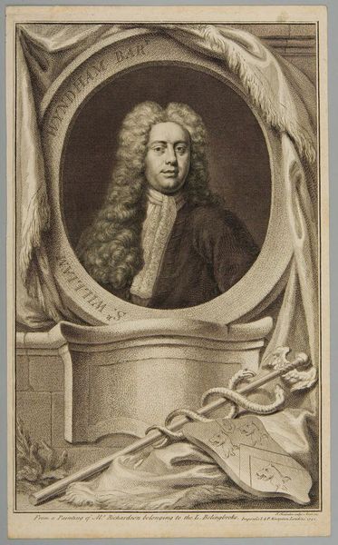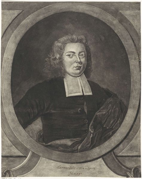 Curator: Let's turn our attention to this intriguing portrait of Thomas Prince by Peter Pelham. The composition is quite striking. Editor: Indeed. The monochrome palette lends it a gravity, and the textural contrast between the subject's wig and garments is quite interesting, especially considering the probable printmaking process. Curator: The oval frame creates a sense of enclosure, focusing our gaze intensely on Prince's face and the carefully rendered folds of his clerical attire. The lines create an emotional tension. Editor: Given the context of colonial America, I wonder about the specific materials Pelham had access to. Was he importing inks and paper, or relying on local resources? It speaks to the constraints and innovations of early American artisanship. Curator: The formal pose and attire are markers of status and intellectual authority, yet there's a certain vulnerability in his expression as well. Editor: Perhaps Pelham, as a craftsman, was acutely aware of the social dynamics at play. The very act of creating this portrait, the labor involved, challenges simplistic notions of class and hierarchy. Curator: A fascinating work that holds both visual appeal and deeper meaning. Editor: Absolutely. It really opens questions about the artistic and material conditions of the period.
