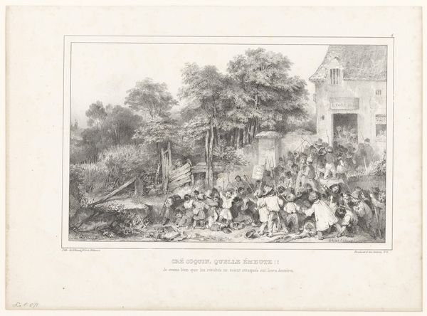 Curator: Here we have Nicolas Toussaint Charlet's "A Scuffle, 1832," rendered with lithograph, ink, and watercolors on paper, here at the Rijksmuseum. It's a fascinating look into urban unrest of the period. Editor: Whew, it feels like I walked right into the middle of it. Dense, crowded, and with this swirling sense of movement that’s kind of exhilarating and unsettling at the same time. The muted tones amplify this agitation, and even make the piece feel cold. Curator: Exactly. Charlet captured the spirit of social upheaval through the lens of genre painting. In the post-Napoleonic era, street scuffles were almost performances of public dissent. Watercolors add depth, don't they? Editor: They do. But look how deftly he handles light and shadow – it adds a dramatic intensity that belies its modest scale. And that windmill in the background! Juxtaposed against the chaotic throng, it suggests maybe something more significant than just an ordinary fight brewing beneath the surface, doesn’t it? Like societal pressure slowly pushing the common person toward resistance. Curator: Precisely! It subtly embeds a broader socio-political reading into an ostensibly simple street brawl. The placement of figures creates implied relationships within this scuffle that hint at class tension. Consider that backdrop; the architecture and figures create a sense of claustrophobia for those participants in the street who are further from its perceived comfort. Editor: Ah, you're good, like finding metaphors hidden in plain sight. To me, it just screams, “Watch out for pickpockets!” Though maybe the real theft here is the gradual erosion of societal harmony. Curator: An acute point. In observing such artworks we consider that beyond mere observation, art holds space to witness history through varied, even intimate perceptions. What someone considers mundane, such as neighborhood architecture, to me, it holds much about wealth disparity between then-citizens and that societal force they contended against. Editor: Absolutely, stepping back into the mindset of 1832 truly lets me sense not only what went on outside but within. Curator: Indeed. Charlet's ability to merge individual character study with broader societal critique provides a lens to reflect on public sentiments across time and place. Editor: Right! A deceptively detailed, evocative snapshot pulled from a moment brimming with tension. It speaks to a society far from settled, even amid pastoral surroundings.