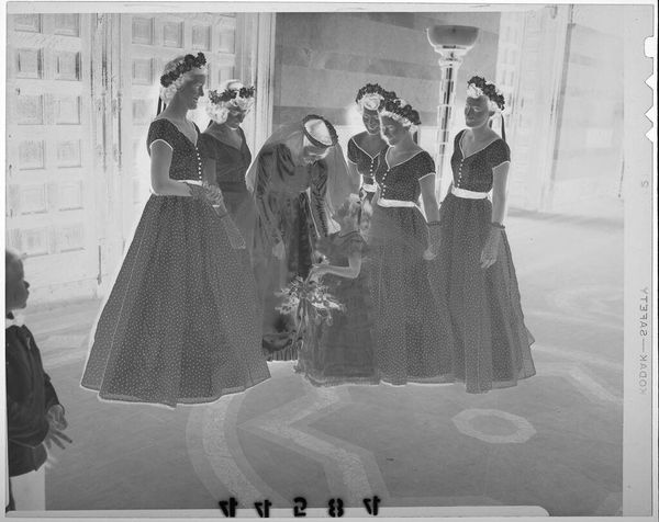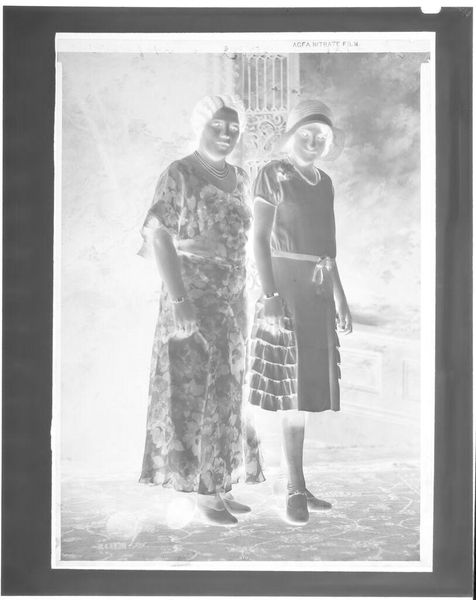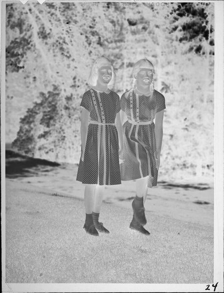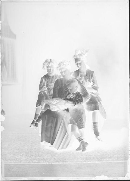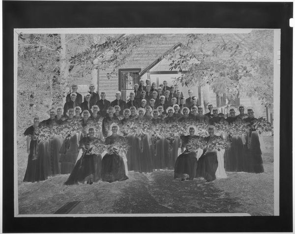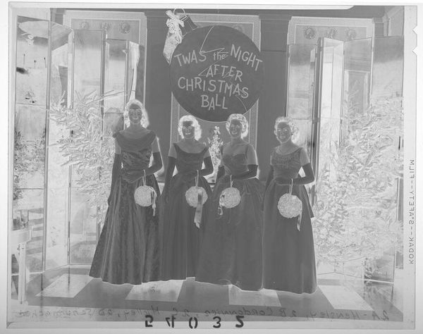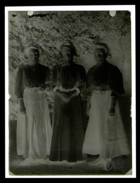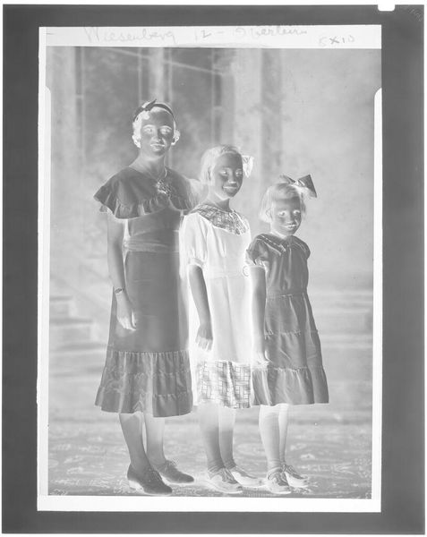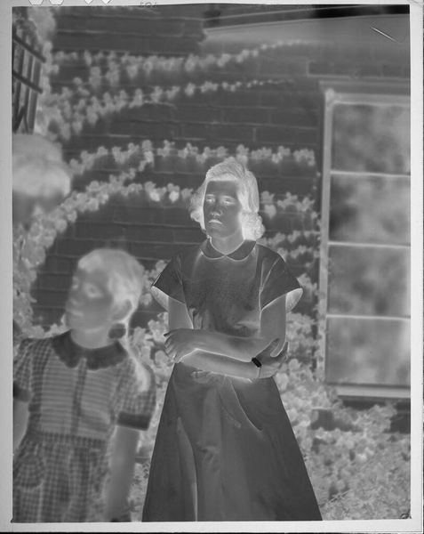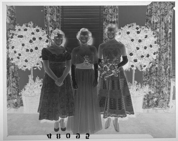 Editor: This is an intriguing photograph by John Deusing, it's called "Untitled (three girls with bibles, candles and rosaries)." The negative image makes it difficult to read, but I’m struck by the emphasis on objects. What can you tell me about the work? Curator: Consider the material conditions of this image. The photographic process itself, the cost of materials, who had access to this technology at the time it was made? Further, what is the social context of these objects – the bibles, rosaries, and candles? How do they function as markers of identity and social status? Editor: So, you’re seeing the photo less as an image and more as a record of materials and social standing? Curator: Precisely. We should explore the labor involved in producing these items, and their roles in the lives of these girls. Editor: Fascinating. I never considered the objects as individual products with their own histories. Curator: And how might mass production of these objects change or reinforce cultural values? Editor: I see how a materialist approach provides a different lens for understanding art. Thanks!