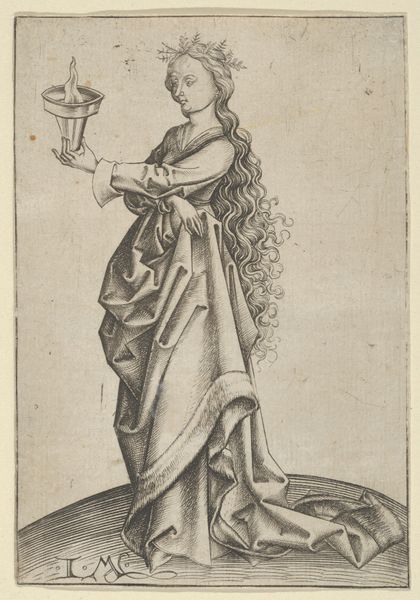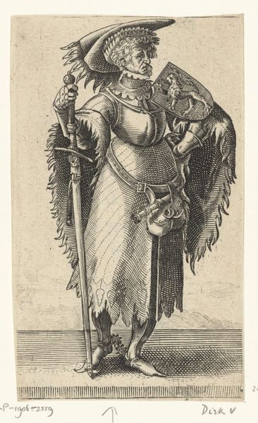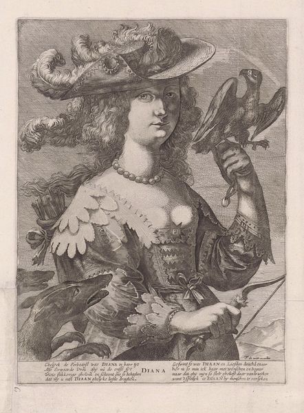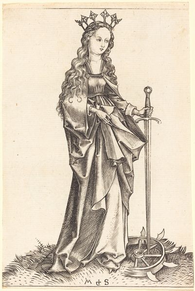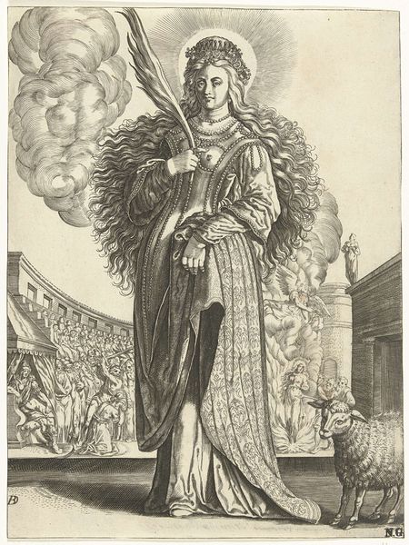 Curator: Pieter de Bailliu's engraving, "Saint Catherine of Alexandria with Emperor Maxentius," made sometime between 1623 and 1660... there's such a serene, powerful energy here. Editor: My initial feeling? Slightly unsettling. She's radiant, sure, with that baroque halo and determined gaze, but the slumped body of Maxentius at her feet is definitely doing some heavy lifting, narratively speaking. It speaks volumes about power and subjugation. Curator: True. But to me, the light catches her flowing gown just so—it looks almost like liquid light. I'm intrigued by the halo, radiating outwards—not a solid shape at all! And, this is silly maybe, but she somehow seems both very earthly and otherworldly. That confident gaze; but a bit sad, too? Editor: Let’s break it down. Catherine, an intellectual, refusing to worship pagan idols, challenging Emperor Maxentius, who then, legend has it, attempts to kill her on a spiked wheel, which miraculously breaks! Then she's beheaded. This print freezes a moment of triumph, but the horror of the story hangs in the air. It's about the power of faith against oppression. And a pretty gruesome tale! Curator: It makes you think about who gets to control these kinds of narratives too, right? Someone, probably a dude, gets to immortalize the Saint, after she is long gone, based on how *he* wants to frame this. Editor: Exactly. And this particular "take" shows Catherine as the victor over male authority and tyrannical power. Think about that sword she’s casually leaning on—not bad for a supposedly 'passive' woman. The crown? Symbolizing that her strength comes from something beyond earthly authority. We should consider how these portrayals of women reinforce or subvert social structures, religious and gendered norms! Curator: Yeah, like, who benefits when we turn a complicated, intellectual woman who refuses to compromise into a symbol, versus a whole person? It is like we, too, want to chop her up and serve her a certain way. Hmm... Editor: Food for thought, indeed. Ultimately, this work functions as more than just an artwork; it embodies historical narratives that continue to fuel discussions on power, faith, and identity. Curator: I came for the light, and now I am off to fight tyranny... thanks for cracking open my perspective here, let's keep it up!