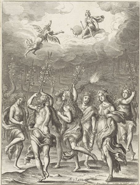 Curator: Welcome. Today, we are looking at "Westenwind", an engraving created sometime between 1560 and 1600 by Johann Sadeler I, currently residing here at the Rijksmuseum. Editor: It's striking how busy the composition is. The eye bounces between figures, landscape, text… and yet, somehow, it’s all elegantly balanced in shades of grey. Curator: Indeed. Sadeler utilizes allegory within a carefully crafted landscape. We see Flora, goddess of flowers, accompanied by Zephyrus, the West Wind. Their presence is meant to evoke springtime and rebirth. Below, the ground is populated with other figures, almost frozen in place. The scene's very ordered, but the symbolic associations are quite fertile. Editor: Symbolism definitely abounds. Note how Flora is rendered: overflowing with flowers and plant life. This emphasizes her role as the giver of life and growth. Her connection to springtime and renewal is almost palpable, isn’t it? She is presented as fully mature but approachable with the way she has turned her glance to the observer, while her flowing hair enhances the lively moment represented. Curator: Absolutely. Zephyrus is blowing flowers into the landscape. He’s an agent of transformation, isn’t he, acting almost like a catalyst to Flora’s bounty. Observe the clouds of smaller cherubic figures above, enhancing the air of classical mythology so crucial to this Renaissance interpretation of springtime's symbolic birth. There's also a deliberate use of contrasting planes. Editor: Precisely, the lower level with static mortal-looking bodies and a distant range that blends towards an idyllic vista on one side; and then the other part above it: dynamically composed yet symbolically packed and layered! And you could analyze each section independently regarding its tonal variety. Curator: In the Northern Renaissance tradition, engraving lends itself particularly well to this layered density of visual information, right? Consider how a single line can create both depth and surface detail. The cross-hatching in the sky creates an active, textured background, while the fine lines used to render the figures highlight their individual beauty. The script as well reminds of that time; overall the technique and symbolic elements underscore the artist's profound understanding of how to weave together nature, culture, and mythology into a coherent whole. Editor: It seems, despite its complexity, that the success of the image emerges precisely from that interwoven nature of things; perhaps this points toward its timeless and continuing appeal.