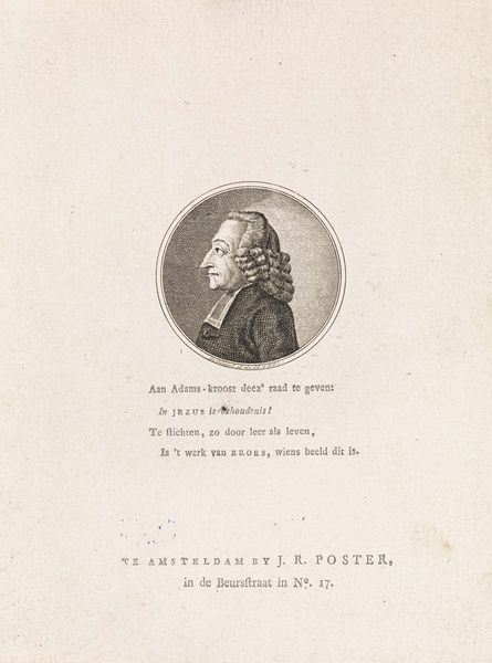 Editor: Here we have "Portret van Johannes Lambertus Huber," created in 1795 by Jacobus Wijsman. It’s an engraving. I'm immediately struck by its starkness. The fine lines create such a delicate, almost ghostly, presence. What do you see in this piece? Curator: Ghostly is a beautiful way to describe it. For me, the engraving feels like a whisper from a very different era. Look closely at the details – the powdered wig, the inscription. It speaks to the age of enlightenment and revolution. A revolution where prints like this could disseminate ideals like… I'm not sure… what is the text underneath saying? "Freedom?" Can you imagine a world where images and ideas were hand-scribed? I think about that weight. Editor: Yes, the text does talk about freedom! I'm so used to instantly sharing images, it’s interesting to think of this as a method for spreading ideas slowly, deliberately. What effect do you think that has? Curator: It’s romantic isn’t it? So many thoughts and decisions must happen with this art form… Each line carries significance. I am moved by how different eras reflect about the very nature of knowledge… We now often consider speed and access, where something is seen once and lost, to be very important. This reminds me to slow down when engaging with information. Does that hit you too? Editor: Definitely! It really makes me think about how we value and consume information today. Curator: Perhaps we should trade our screens for engravings sometimes!