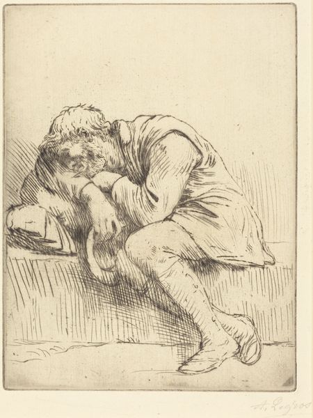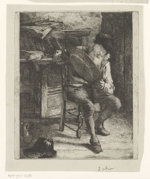 Editor: This is Cornelis Bega’s small etching, "The Smoker." It's striking how the stark lines create such a detailed scene. What do you see in terms of its formal composition? Curator: The masterful manipulation of line and shadow is immediately apparent. Observe the interplay of light, achieved through varied densities of etched lines, defining form and texture. How does this distribution of light guide your eye? Editor: I notice the deepest shadows behind the figure, which really pushes him forward, almost isolating him. The artist really uses dark and light to draw attention to the act of smoking itself. Curator: Precisely. The strategic use of chiaroscuro creates a focal point, elevating the quotidian act of smoking into a subject worthy of contemplation. This work challenges us to find beauty in the everyday through its formal elements. Editor: I see that now. It's amazing how much meaning can be conveyed through line and shadow alone. Curator: Indeed. The work's strength lies in its formal rigor, revealing depth and complexity in a seemingly simple subject.
