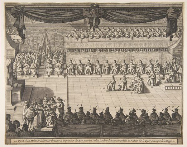 Curator: Sébastien Leclerc I created this delicate drawing entitled "A Gathering in a Church," sometime between 1650 and 1714. You can find it on display here at the Metropolitan Museum of Art. Editor: Wow, my first thought? Organized chaos! It's so precisely drawn, but teeming with people. The mood is both serene and...a little claustrophobic, honestly. I feel like I'm observing something quite formal. Curator: Formal is key. Leclerc was capturing a highly structured environment. Note how space, power and social rank are so methodically separated from one another in his rendering of the church interior. Editor: Yes! The tiered seating emphasizes those power dynamics; who gets to be closest to the altar and so forth... it’s very intentional. Almost feels theatrical, like everyone has a very specific role to play on this stage. I find my eyes drawn to the periphery, actually...imagining their whispered conversations. Curator: Precisely. While seemingly objective, Leclerc’s image implicates a highly constructed social order and its underlying ideologies. Consider who is seen and unseen, and how the representation reflects prevailing norms and biases. Editor: You're right, there's something almost…voyeuristic about it, now that you mention the hierarchies. The line work is incredible though—so controlled, yet the washes of color give it a certain lightness. It really pulls me in. Curator: It’s that balance between detail and wash that gives the impression of reality without becoming photographic. Consider Leclerc's political leanings during his time in the Académie Royale. How might that have impacted his portrayal of such institutions? Editor: Interesting question...I didn't know about his political activities. It makes me wonder about the stories behind all these faces. Curator: Exactly. And that is the crux of it: art serves as a lens through which we understand society, revealing its beauty, its contradictions, and its struggles. Editor: It really does...I keep getting drawn back to the details... this makes you really feel as if you're a member of this time in history. It feels incredibly intimate. Curator: Indeed. "A Gathering in a Church," far from being a simple snapshot, becomes an invitation to reflect on the intersections of power, faith, and representation.